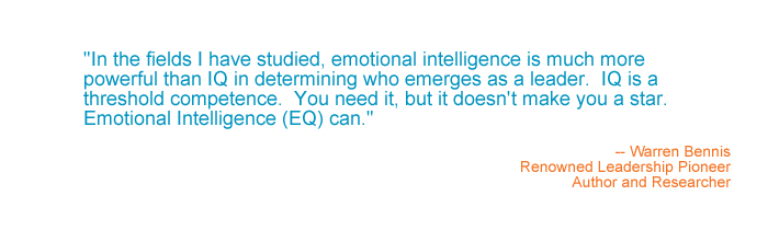 Although a certain degree of “book smarts,” analytical and technical skill may get you to the leadership door, research studies indicate that the key to being an outstanding leader rather than one that is merely adequate is emotional intelligence (EQ). We all know stories of highly intelligent and skilled executives being promoted and failing at the job.“In the fields I have studied, emotional intelligence is much more powerful than IQ in determining who emerges as a leader. IQ is a threshold competence. You need it, but it doesn't make you a star. Emotional Intelligence (EQ) can.”